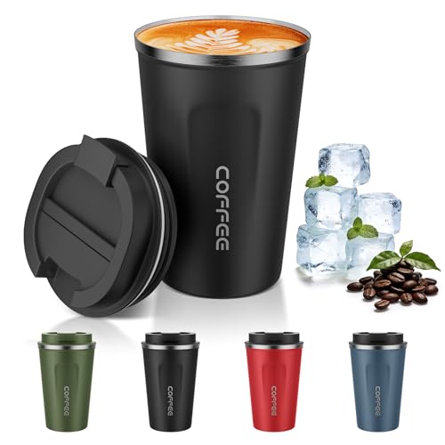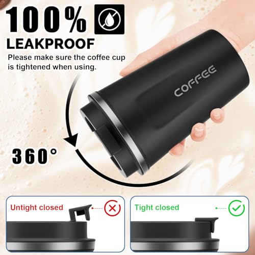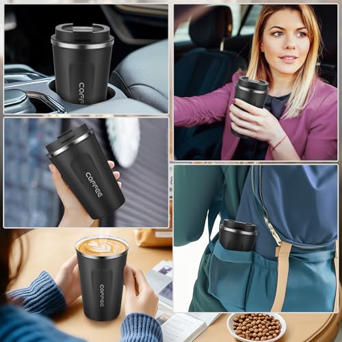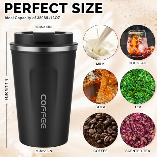 MOMSIV - مج قهوة معزول حراريا مع غطاء مانع للتسرب بجدار مزدوج من الفولاذ المقاوم للصدأ وقابل لإعادة الاستخدام للمياه والمشروبات الساخنة والباردة والقهوة والشاي أثناء السفر وفي السيارة من مومسيف - 380 مل، أسود