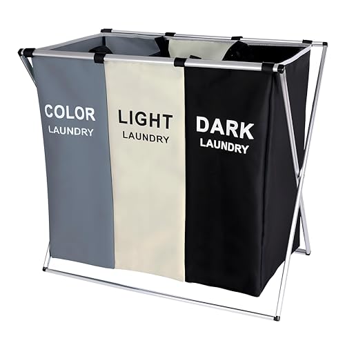 Generic - 135L Foldable Laundry Sorter Basket with Aluminum Frame Include 3 Dividers 26"W x 24"H Dirty Clothes Storage Bag for Bathroom Bedroom Home (3 Tier) (White+Grey+Black)