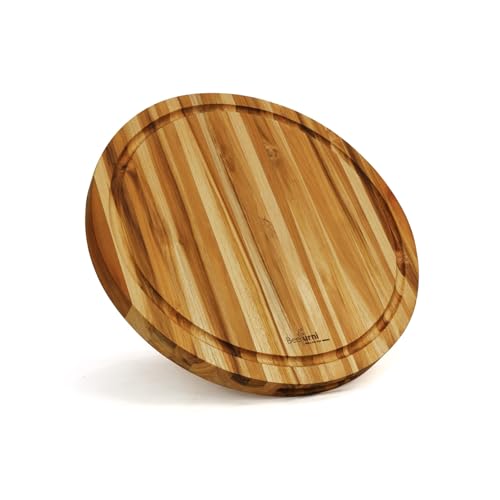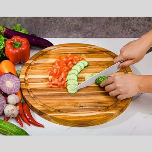 PULLAFUN - 15.8 x 15.8 Inch Teak Cutting Board, Round Wood Cutting Boards for Kitchen, Thick Wooden Chopping Board With Juice Groove, Reversible Butcher Block Cutting Board for Meat, Cheese, Charcuterie