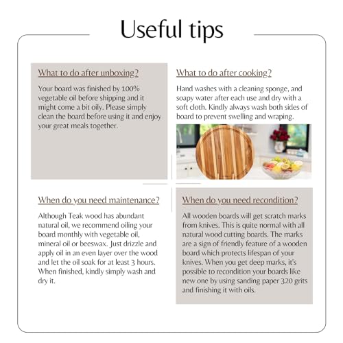 - Easy to Clean: This teak wood cutting board will not absorb food stains. Easy to clean by hand, no more flavor mingling while you cook and revealed a nice deep shine once oiled. XXL Cutting board, Size : 15.8 L x 15.8 W x 1.25 inches.