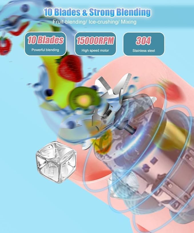 - 1.5L Large Portable Blender, Personal Shaker and Juice Blender, Strong Blender with 10 Blades, 3000 mAh USB Rechargeable Fresh Juicer Cup for Outdoor Sports, Gym, Kitchen, Office and Travel.