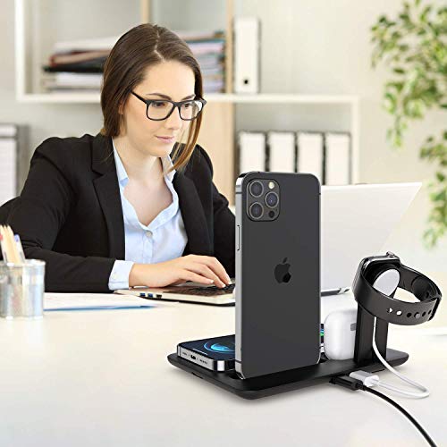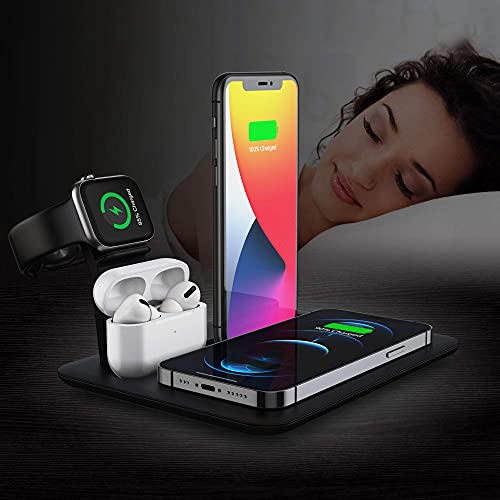 NALACAL - شاحن لاسلكي بقدرة 15 وات وقاعدة شحن سريع 4 في 1 لسلسلة آبل اي ووتش 6/5/4/3/2/1، حامل شاحن لاسلكي متعدد الوظائف وحامل شحن لاسلكي لآيفون 13/12/11 وسامسونج S21/20