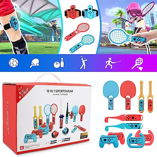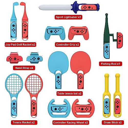 - 🎮【18 in 1 Swtich Sports Accessories Bundle】The Switch accessories includes whatever you need: 1 x fishing rod,1 x sport lightsaberx, 2 x table tennis bat, 2 x controller Grip, 2 x tennis racket, 2 x racing wheelk, 2 x hand strap and 2 x leg strap, 2 x drum stick, 2 x golf club. Buy this motion control game accessories bundle will save more than half than buying them separately.