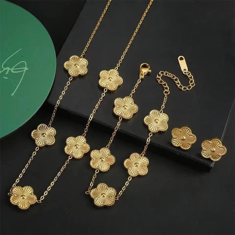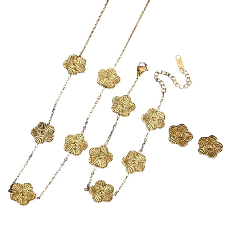 Generic - 18K Gold Plated Stainless Steel Chain Bracelet Earrings Set for Women Luck Engraved Four Leaf Connected Black Jewelry Gift