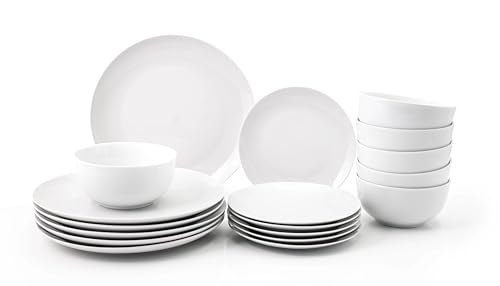 simpa - 18PC Dinnerware Porcelain White Set: 6 Dinner Plates, 6 Side Plates & 6 Bowls. Dishwasher & Microwave Safe.