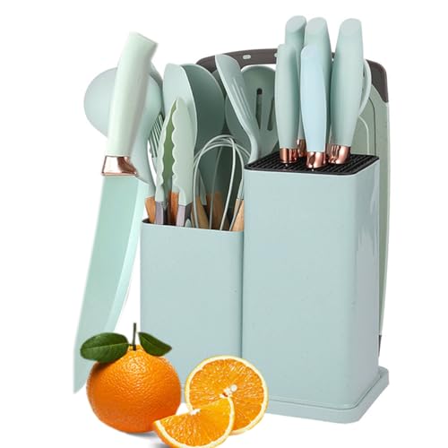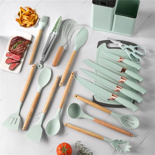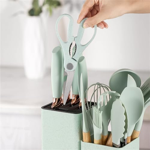 YAQIZENG - 19 Pcs Kitchen Cooking Utensils and Knife Set with Block, Include 11 Pcs Silicone Cooking Utensils Set 5 Pieces Sharp Stainless Steel Chef Knives Scissors Whisk Tongs and Cutting Board (Light Green)