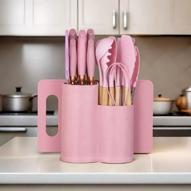 - Comprehensive 19-Piece Set: This set provides a complete collection of kitchen essentials, typically including a variety of silicone cooking tools and a stainless steel knife set , often with a cutting board and a storage holder.