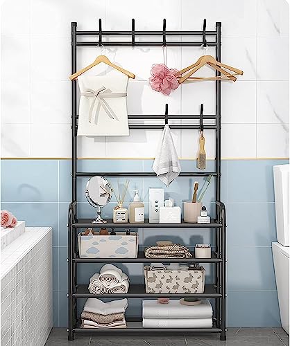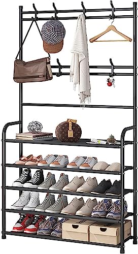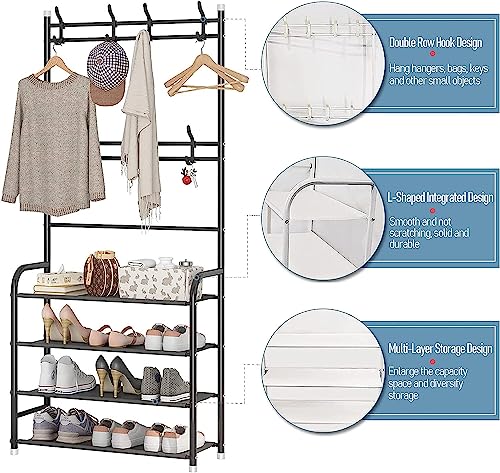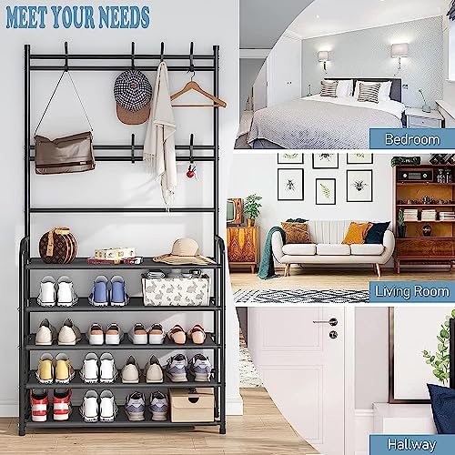 1st - 1ST Shoe Rack Coat Rack Storage Rack with 4 Tiers Shoe Organizer Clothes Rack with Hanging Hooks Entryway Hallway Shelf for Hanging Storage (Black)