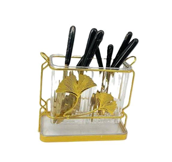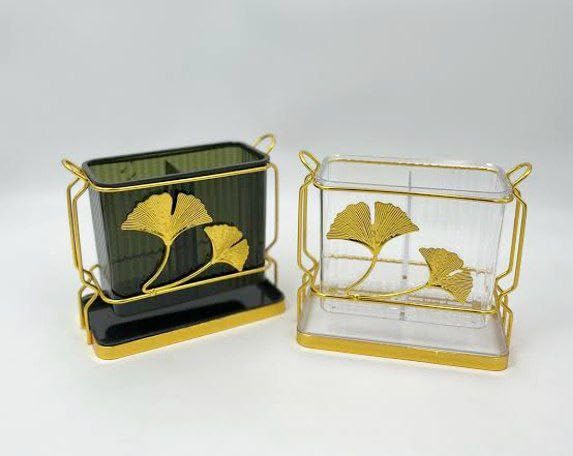 - VERSATILE DESIGN: 2-in-1 utensil organizer featuring clear acrylic holders with an elegant gold metal base and decorative ginkgo leaf pattern for stylish kitchen storage