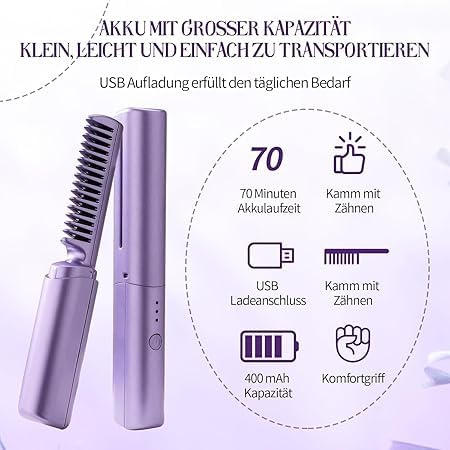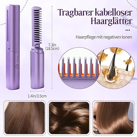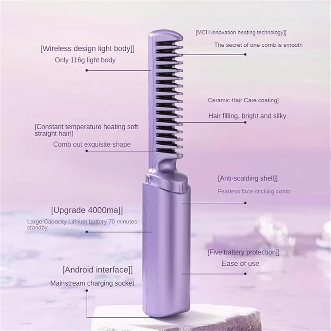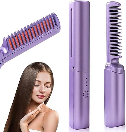 Generic - 2 in 1 Portable Cordless Electric Hair Straightener Brush - Light and Compact, 3 Adjustable Heat Settings, Negative Ion Technology and Ceramic Design for Easy Hair and Beard Styling (Mauve)