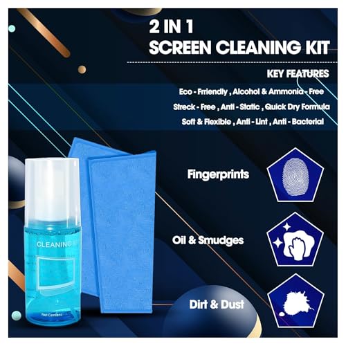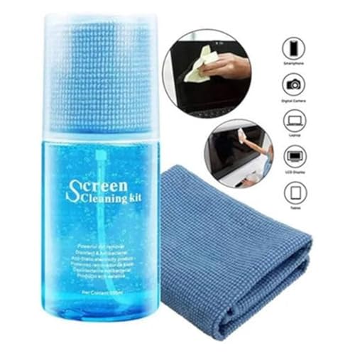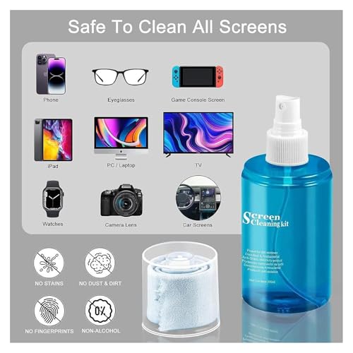 - VERSATILE CLEANING SOLUTION: 2-in-1 screen cleaning kit with 200ml spray bottle and microfiber cloth safely cleans all screens including phones, tablets, laptops, TVs, monitors, game consoles, cameras, watches, eyeglasses, and car screens