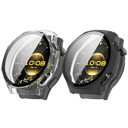 AOOKAY - 2 Pack for Huawei Watch GT6 Pro 46mm Smart Watch Case with Screen Protector, Anti-Drop Anti-Scratch Hard PC Bumper & HD Anti-Fingerprint Tempered Glass Protective Film (Black+Clear, GT6 Pro)