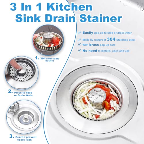 - 3-in-1 Sink Stopper & Strainer: This innovative kitchen essential functions as both a sink drain stopper and strainer, allowing you to stop up the sink to soak dishes or pop it open to drain water and catch garbage and food waste—a must-have for any home and kitchen.
