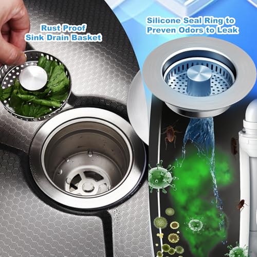 - Removable Filter Basket: The inner strainer basket acts as a smart garbage disposal stopper or catcher, trapping scraps before they go down the drain hole. Simply lift the basket to discard waste—no mess, no hassle, no clogging.