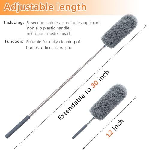 - Telescopic Long Pole : This telescopic rod is adjustable from 12 to 30 inches, allowing you to customize its length for effortless dusting and cleaning. When not in use, it can be conveniently folded down for compact and easy storage.