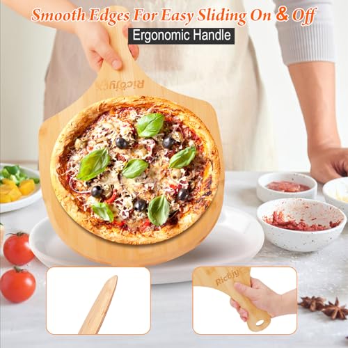 RICOJYCX - قطعتان من قشر البيتزا من الخيزران الطبيعي مقاس 12 انش، لوح تقطيع مع مقبض للبيتزا والخبز والجبن والخضروات والفواكه