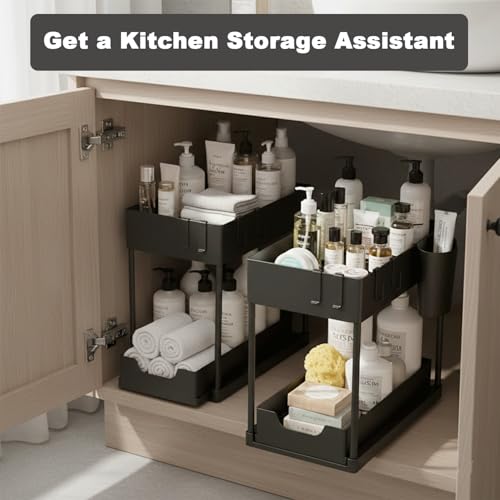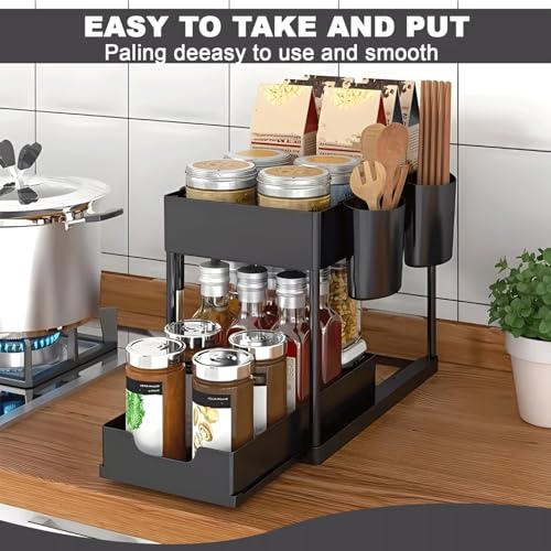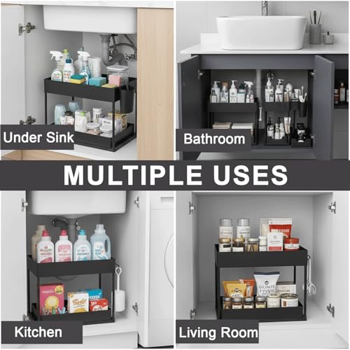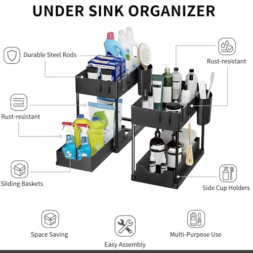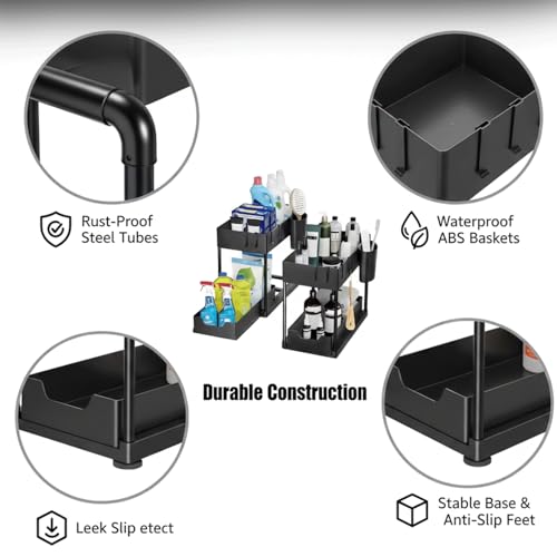 VegiTechs - 2-Pack Under Sink Organizer, 2-Tier Sliding Storage Drawers for Bathroom & Kitchen Cabinets, Pull-Out Basket Organizer with Hooks & Cups, Multi-Purpose Counter and Pantry Storage (Black)