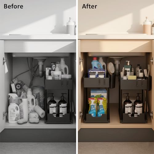 - Multi-Purpose: Perfect for under sinks, bathroom cabinets, kitchen counters, food pantries, laundry rooms, RVs, garages, and more. Use it to neatly store bottles, sprays, towels, tools, snacks, beauty products, and everyday essentials.