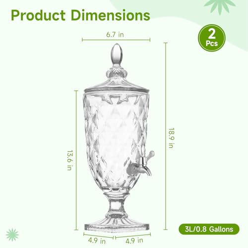 - 【Large Capacity for Party Use】The package includes 2 clear glass juice dispensers, catering to your daily and party use needs. Measuring 6.7×6.7×13.6in (without lid), each is capable of holding up to 0.8 gallons/3 liters of beverage, perfect for serving guests at different gatherings.