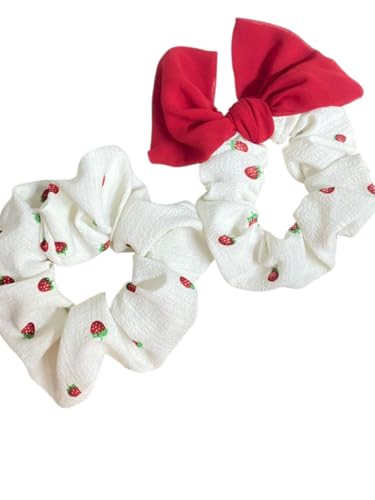- Package Content: 2 Piece Scrunchy Hair Bands, 1 Strawberry on white background, 1 Solid red with bow