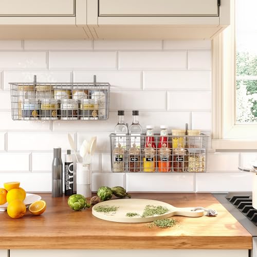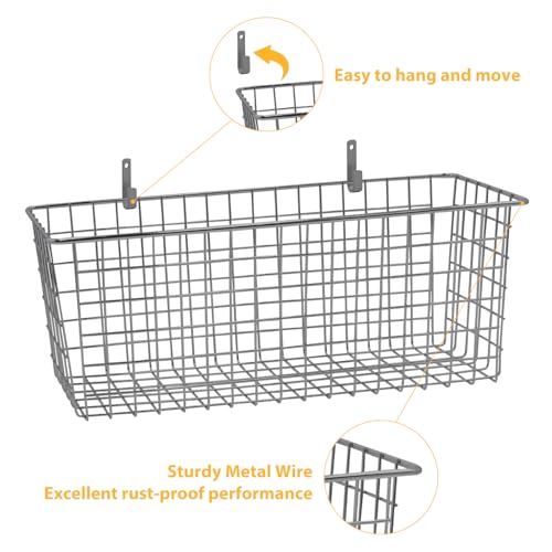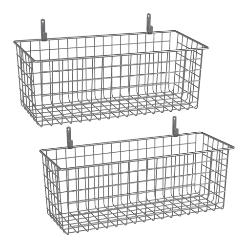 KINLINK - 2 Sets Extra Large Hanging Wall Basket, Grey Metal Wire Baskets with Steel Hooks for Organizing, WallmountedFruit Vegetable Toy Snack Storage, Home Kitchen Bathroom Laundry Pantry Organizer