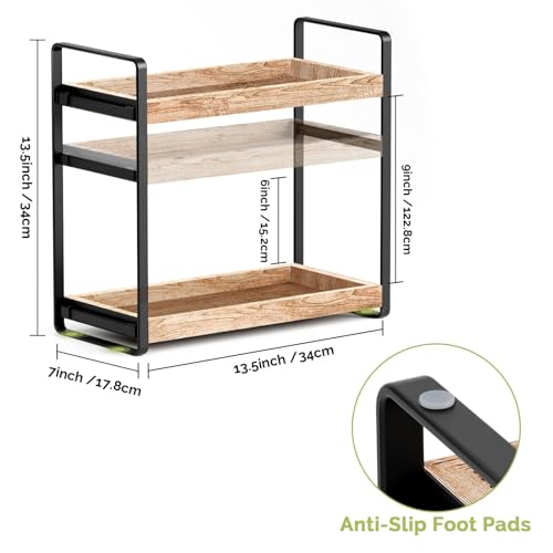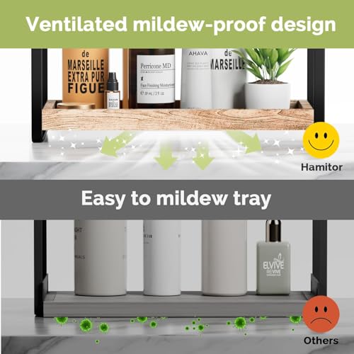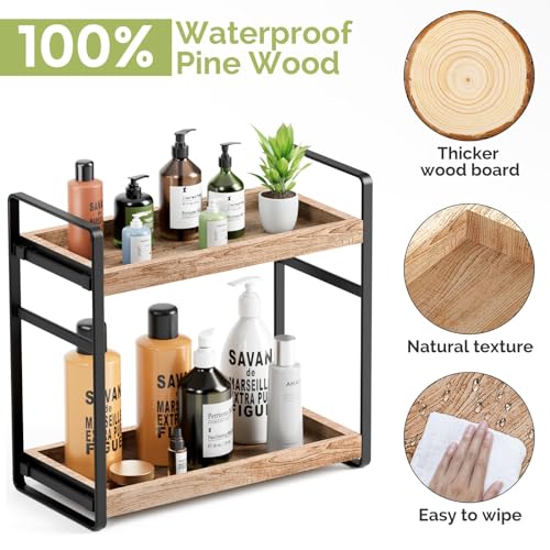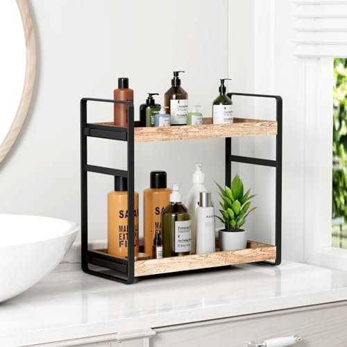 HAMITOR - 2-Tier Adjustable Bathroom Organizer Countertop: No Drill Installation Countertop Shelf for Storage Wood Corner Bathroom Rack for Vanity Kitchen Under Sink- Tiered Tray Makeup Stand Organizers