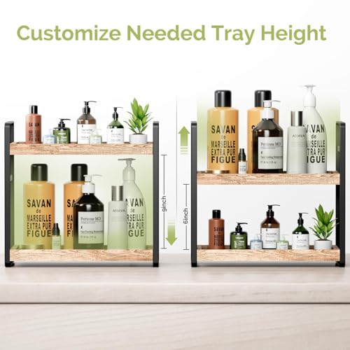 - Adjustable Trays Height: The innovative design of our adjustable height tiered tray allows for higher items to be stored, saving countertop space in your bathroom, kitchen, coffee bar, and restroom. you can customize the height between the first tray to second tray height from 6 inch to 9 inch.