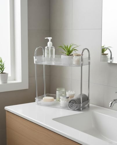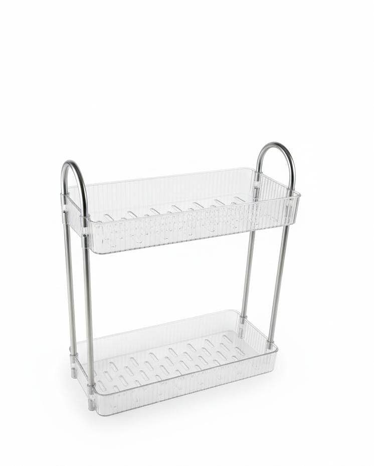 - 2-Tier Organizer: Maximizes storage space for bathroom and kitchen essentials. Stylish Clear Design: Features durable clear acrylic tiers and modern chrome supports. Multi-Purpose Use: Ideal for toiletries, skincare, spices, and small items. Space-Saving Solution: Utilizes vertical space to keep counters clutter-free. Easy to Assemble & Clean: Quick setup and simple maintenance.