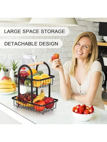 - Detachable 2-Tier Storage Basket with Wooden Handles – Stackable or Separate Design for Fruit, Vegetables, Bread & Snacks, Space-Saving Countertop Organizer for Kitchen, Pantry or Bathroom, Easy to Carry and Use Anywhere