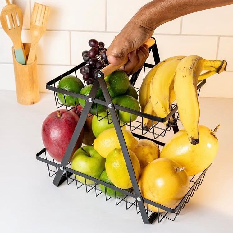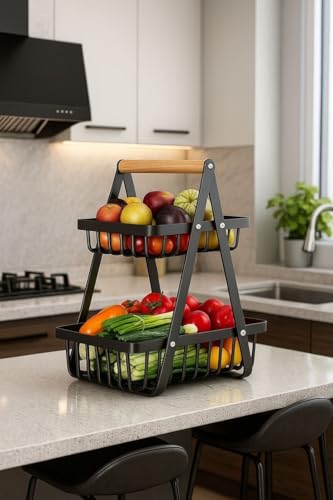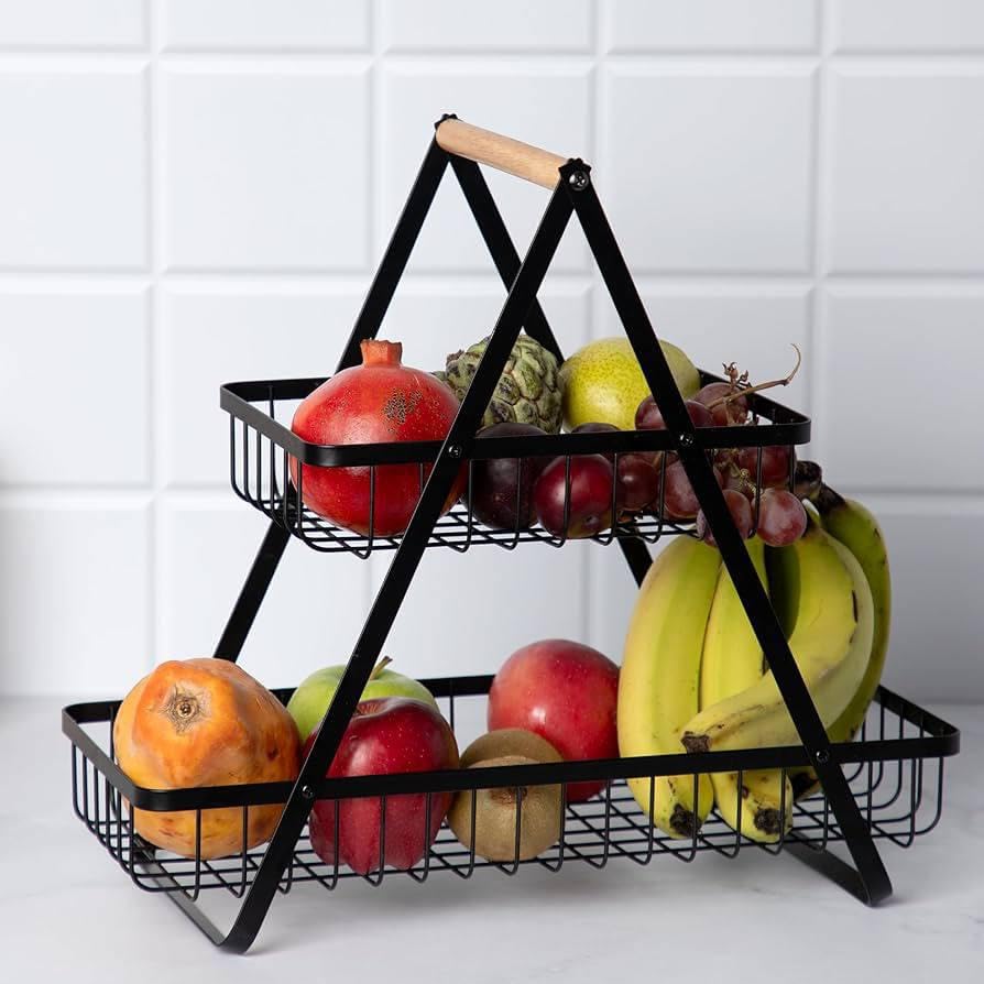 Generic - 2 Tier Black Metal Fruit Basket with Wooden Handles, Countertop Organizer for Fruits Vegetables Bread and Snacks, Sturdy Non Slip Storage Rack for Kitchen Counter and Modern Home Decor