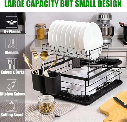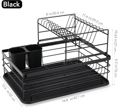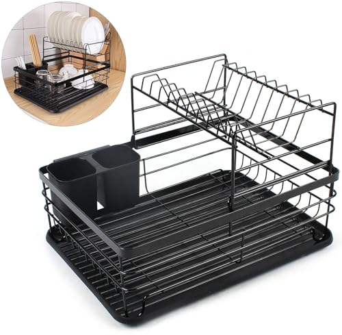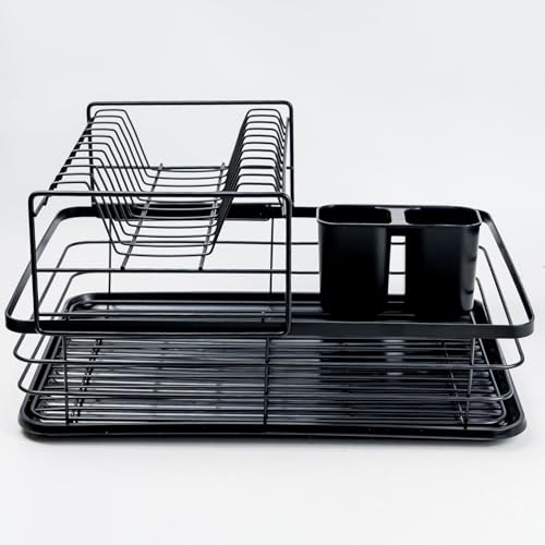 AREXOL - 2 Tier Black Modern Zigzag American Kitchen Dish Drainer Cup Dish Drainer Cutlery Organizer with Smart Drainer, Rustproof