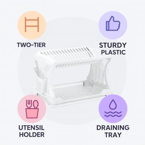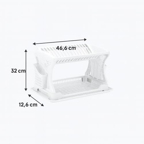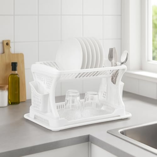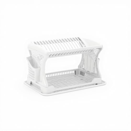 Generic - 2 Tier Dish Drainer Rack with Cutlery Holder and Drip Tray – Large Capacity Double Layer Drying Stand for Kitchen Countertop (White)
