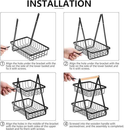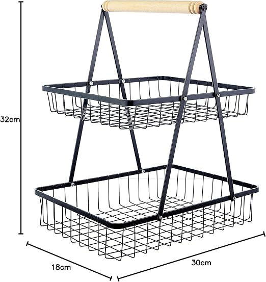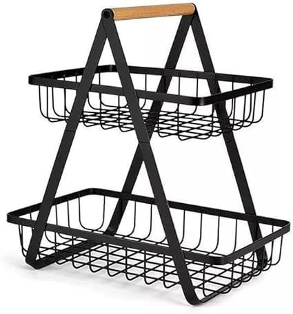 - The 2-level countertop fruit basket is perfect for storing fruits and vegetables, keeping your space organized. Open wire basket allows air to be circulated more freely, keeping fruits and vegetables breathable. It is also a perfect home storage solution to match any style and decor. This basket is made of iron with a powder coated black coating to make it rust resistant and water resistant, ensuring a long lasting use. It also features an easy to carry wooden handle that makes it easy to carry right here or there on the go.