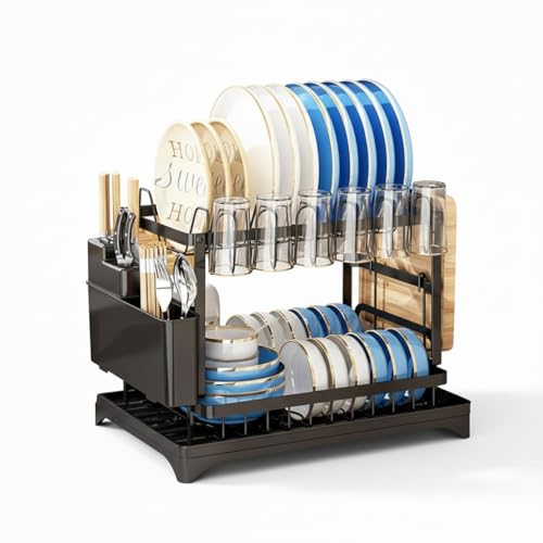 Generic - 2 Tier Plate and Cup Organizer, Dish Holder with Water Drainer, Kitchen Utensil Organizer with Spoon and Knife Holder, Black