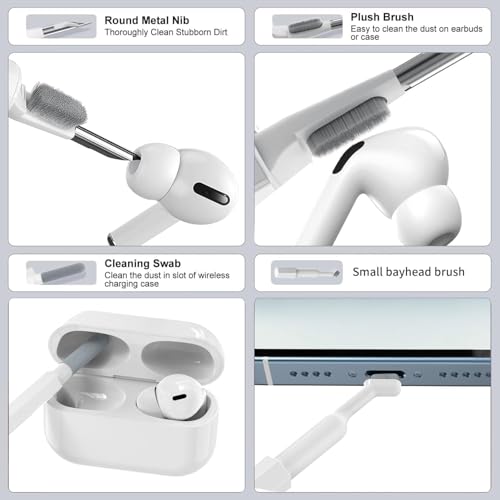 - 【Headphones Cleaning Pen】Cleaning pen with a metal tip can deeply clean stubborn dirt, mini brush cleans the earphone mesh; round brush and soft brush can clean the dust and dirt hidden in the deep of the charging case. There is an extended handle for these accessories, making them easier to use