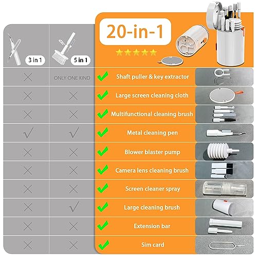 - مجموعة الكل في واحد 20 في 1: تتضمن هذه المجموعة المدمجة مجموعة كبيرة ومتنوعة من الأدوات مثل فرشاة الكيبورد ومنظف الشاشة وقلم تنظيف سماعات الأذن وسحب أغطية المفاتيح والمزيد لتلبية جميع احتياجات التنظيف الإلكترونية الخاصة بك.