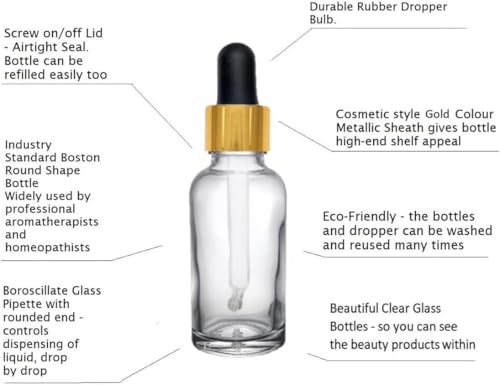 - Package Content: Set of 2 Clear Glass Droppers with Gold Lid and 1 Micro Dropper