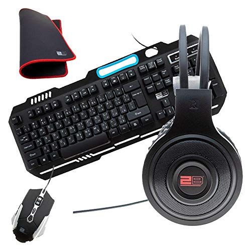2B - مجموعة كومبيوتر الالعاب 4 في 1 (KB344) من 2 بي، مكونة من كيبورد سلكي معدني باضاءة خلفية، وقاعدة ماوس، وماوس سلكي وسماعة رأس سلكية للالعاب، متعدد الالوان، من 2B