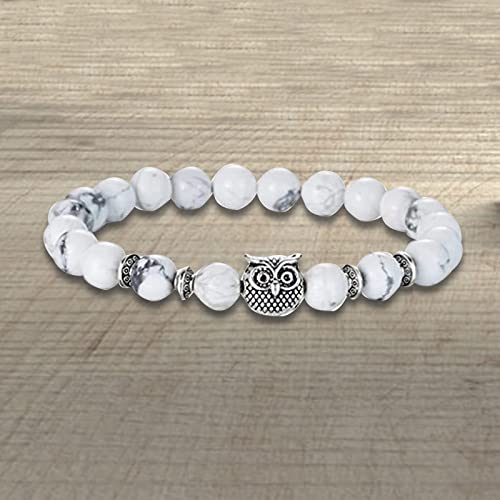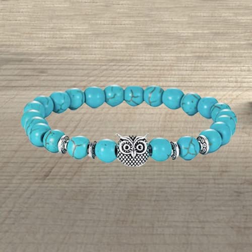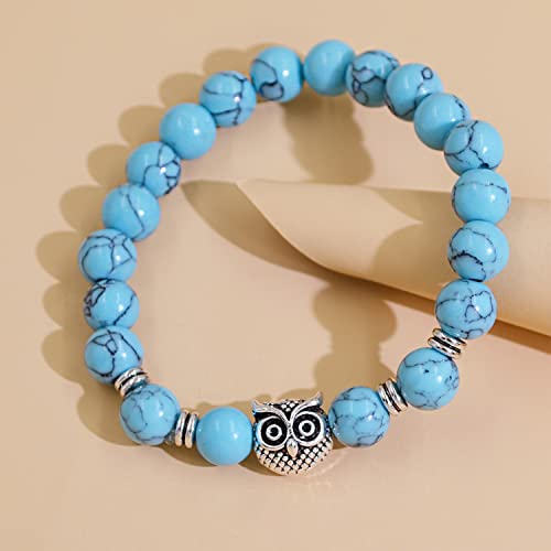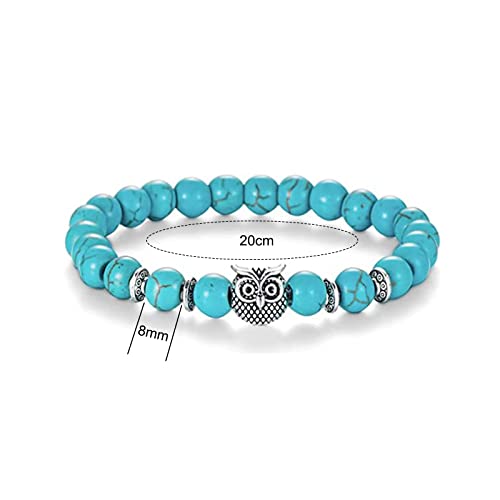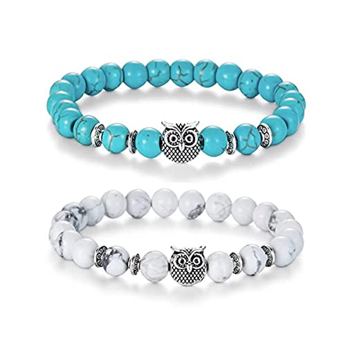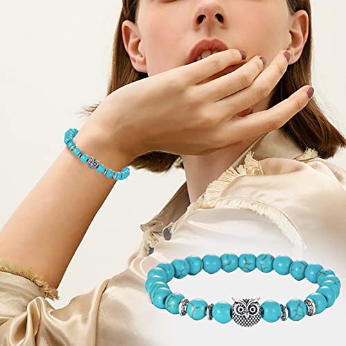 TKSDVTI - 2Pcs Beads Bracelets for Women Men 8mm Turquoise Bracelets with Owl Pendant Natural Healing Bracelet Gemstone Bracelet Chakra Bracelet Anxiety Bracelet Elastic Couple Bracelets Jewellery for Women