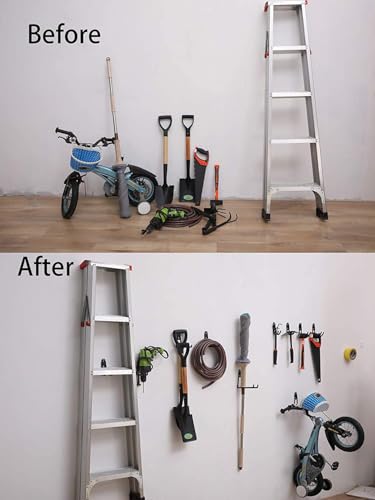 - مادة متينة للغاية: خطافات المرآب مصنوعة من الستيل الصلب عالي التحمل واللوحة معززة بثلاث طبقات، مما يوفر سعة تحميل فائقة، خطافات مفيدة رائعة للسلالم والمعدات الرياضية وأدوات تشذيب العشب ومعدات البستنة وغيرها من العناصر الضخمة!