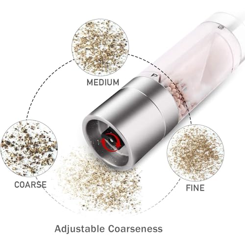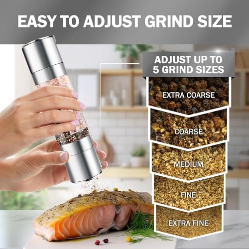 - ADJUSTABLE COARSENESS: The salt and pepper grinders is refillable and made of stainless steel which is durable and rust-resistant. Simply turn the knob on the sea salt Grinder to select fine, medium or coarse to suit your needs.