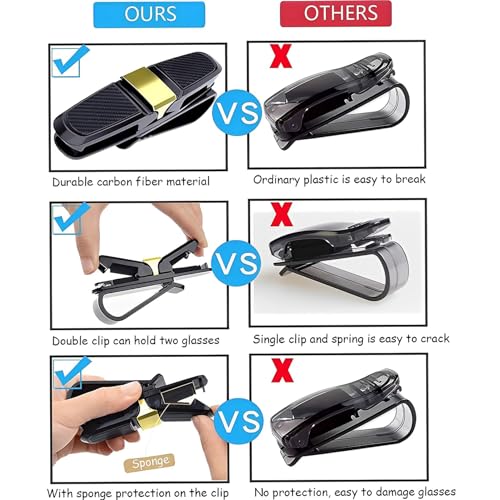 - 🏎️ High Quality of Sunglasses Holder for Car: The sunglasses holder for car is made of high quality ABS plastic material and high strength galvanized metal material. This car sunglasses clip is durable and resistant to deformation and breakage, it can be easily removed and stored, the soft bubble wool at both ends will not scratch or damage your glasses, suitable for most car styles.