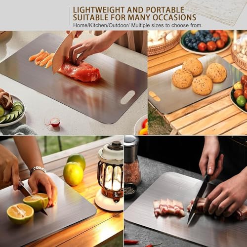 - 2 Different Sizes : Our Titanium Cutting Board set contains 2 sizes:,34x23cm,25x15cm, provides a wide range of sizes for your cutting needs. Both sides can be used, the front side for cutting fruits and vegetables and the back side for cutting meat to avoid using each other.