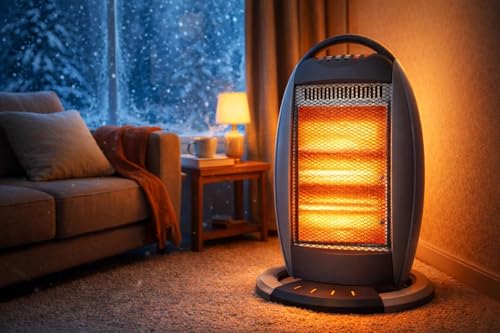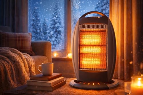 - Enjoy instant and effective heating with our 1200W portable halogen heater, designed to provide warmth and comfort in living rooms, offices, bedrooms, or even bathrooms. This heater features Halogen technology that distributes heat quickly and evenly making it ideal for those cold days. Its compact handle design makes it easy to move between rooms and the rotating feature helps heat distribution in all directions.
