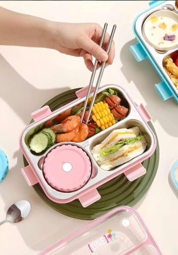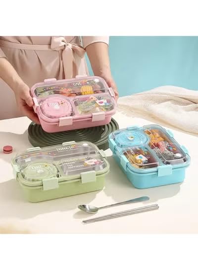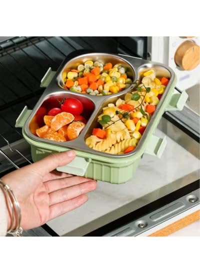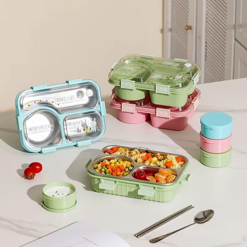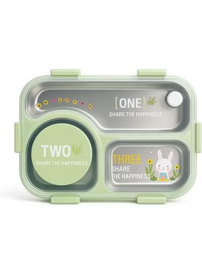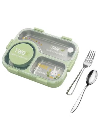Generic - 3 Compartment Stainless Steel Bento Lunch Box | Leakproof Airtight Food Container with Bowl, Spoon & Chopsticks (Green)