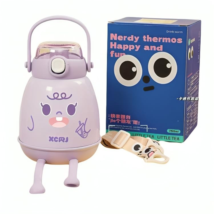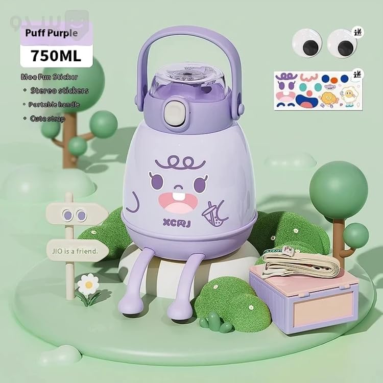 Generic - 3 in 1 Cartoon Water Bottle - Straw and 3 Ways to Drink, Cute Design with Carrying Strap for School and Trips. (Violet)