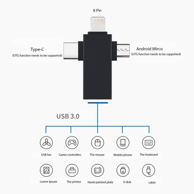 Generic - 3 in 1 OTG Adapter USB to compatible with Micro USB/Type C/Iphone On The Go Converter - (Black)