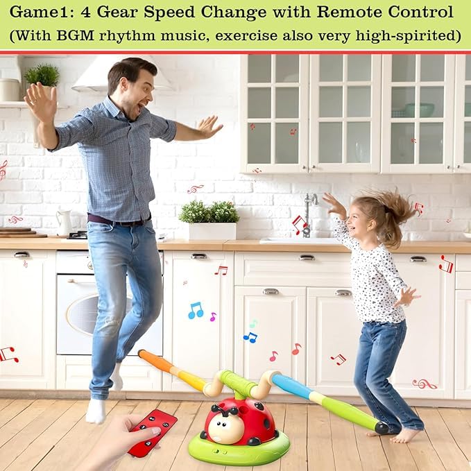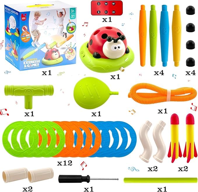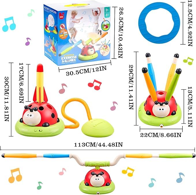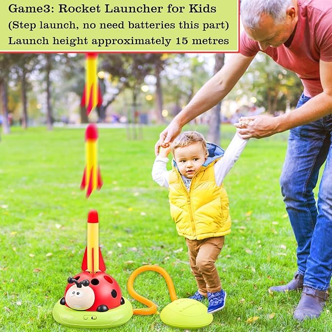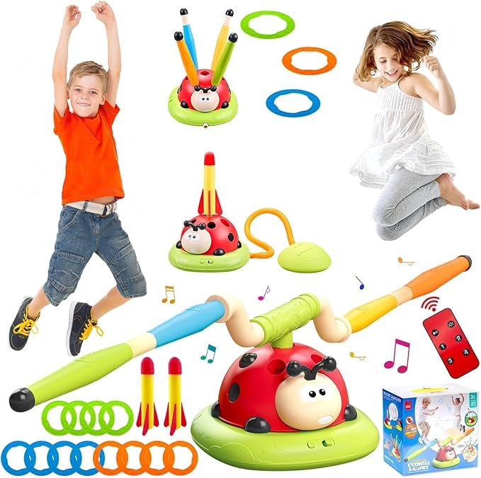 - Multiple game combinations: 3 gameplay combinations can switch freely. No.1 listen to music when skipping rope, inspire the fun of children on the skipping rope. Adults and children can jump rope at the same time to increase parent-child activities and intimacy. No.2 adjustment to the rotation rhythm, find the right time to throw the ring, available in three different colours, multiplayer PK is possible and who scores the most hits wins first. No.3: It can be started by kicking on the foot. The faster children jump, the higher the rocket flies to see which rocket flies higher.