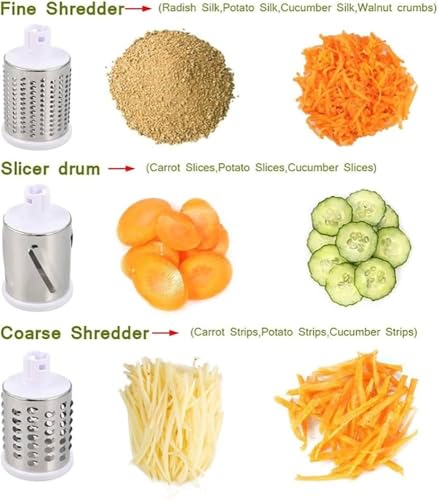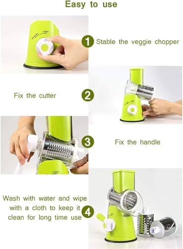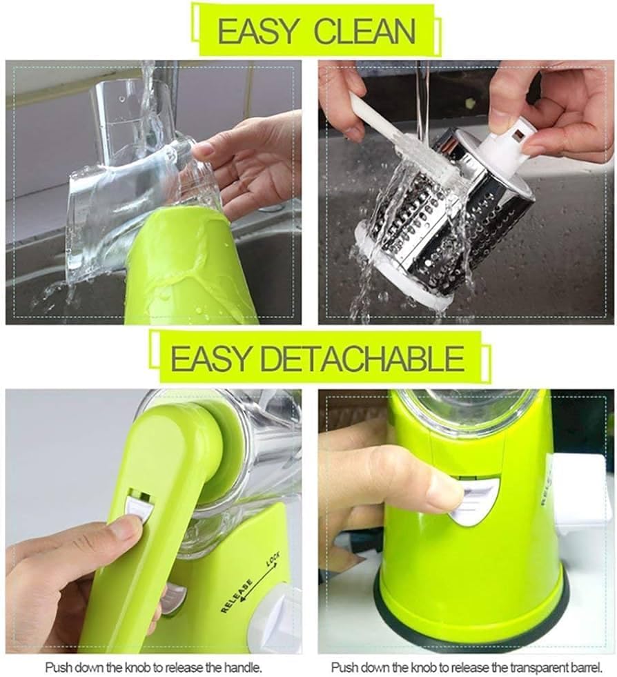 - سهل التنظيف - كان التنظيف سهلاً، فقط اغسله بالماء وامسحه بقطعة قماش للحفاظ على نظافته للاستخدام لفترة طويلة، آمن للاستخدام في غسالة الأطباق. * قطاعة الخضار آلة قطع ماندولين متعددة الوظائف طبلة تقطيع الجبن مبشرة مع 3 شفرات دوارة من الفولاذ المقاوم للصدأ للطحن