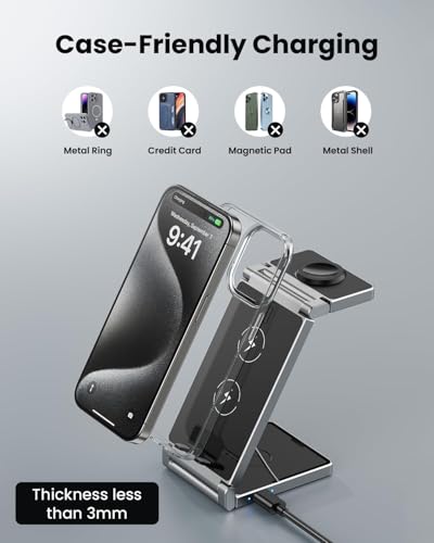 - Case Friendly: Our wireless charging dock is compatible with most cases up to 4mm thick, eliminating the need to remove the case from your phone for convenience during charging.However, make sure to remove any metallic or magnetic attachments that could disrupt the wireless charging experience seamlessly.